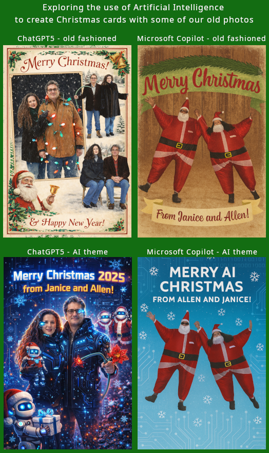 Janice and I were early adopters of creating websites and using digital cameras. In 1997 we adapted the tradition of mailing out Christmas cards to sending out digital Christmas cards (a photo with text) by email...now via Facebook and Instagram, too. This is the website we created to archive these annual Christmas photos. We wish you a Merry Christmas and hope you find some entertainment here.