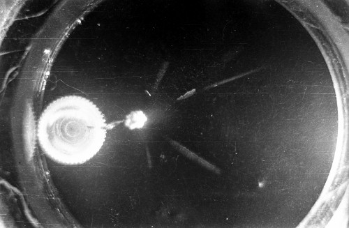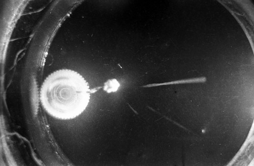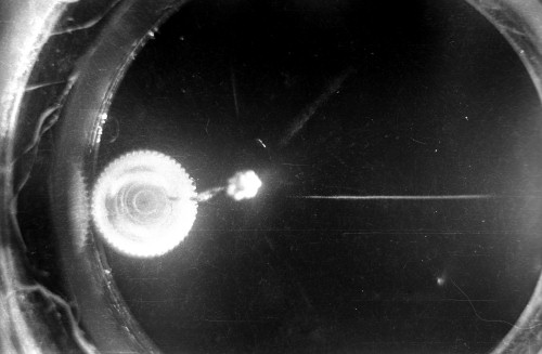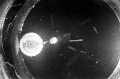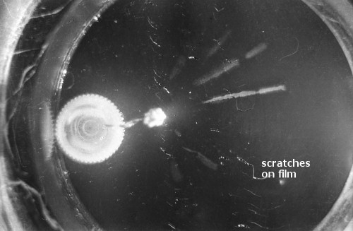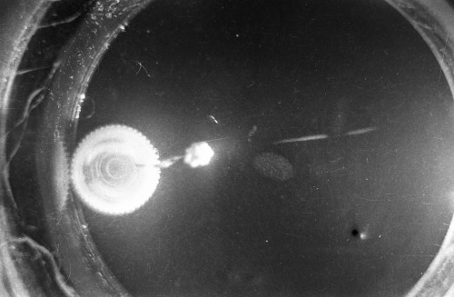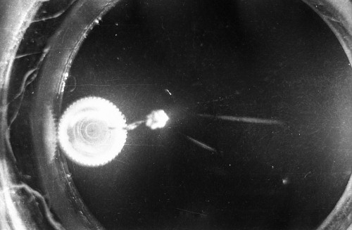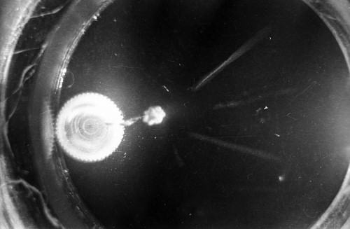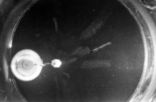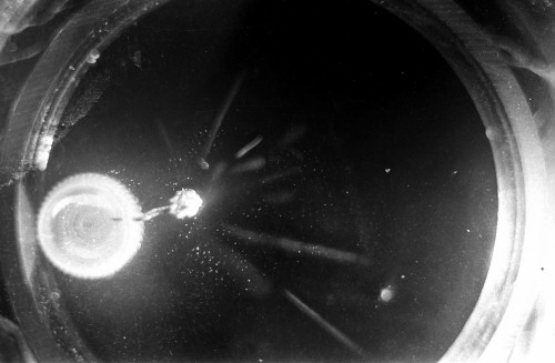 The black-and-white photos shown above were taken using a 35mm camera positioned over the dry ice cloud chamber. A small ball of paint containing radium was used as the source for particles. The radium paint was scraped from old glow-in-the-dark watch faces and glued into a small ball on the end of a wire that was then stuck in a small plastic cap. This project demonstrated how cloud chambers functioned and how physicists had used them to study subatomic particles.