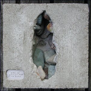 At the beginning of the second season we experimented with adding a hole and a "cut out"--a hole that overlapped one of the edges. We had realized that we could use the clay to not only create open recesses for the rocks, but to also create holes, tunnels, and other crevices and recesses in the cement blocks. We tried it out on the first sculpture we made in June.![]() We liked the effect although it was less interesting and less radical looking than we had hoped. After this first block we started thinking that creating holes or tunnels would have greater possibilities if we were doing them in thicker (or wider) blocks of cement. If the blocks were thicker, we could not only make tunnels but we could imagine placing rocks inside the block in the walls of these tunnels. In our minds eye it seemed like it could be an interesting effect--like that offered by a geode rock. So we went back to Janice's Dad's shop and created a new wooden form for making our cement sculptures. This wooden form was much wider and produced a more cube like cement block. We also had to learn to backwards design and visualize making our clay tunnels and crevices with their internal protruding rocks. We would make a tube of clay and then stick rocks into the clay tube. We would position this in the wooden form and then scoop in the cement around the tube. How the rocks looked sticking out of the clay tube was the opposite of how they would look once the clay had dried and been removed.
