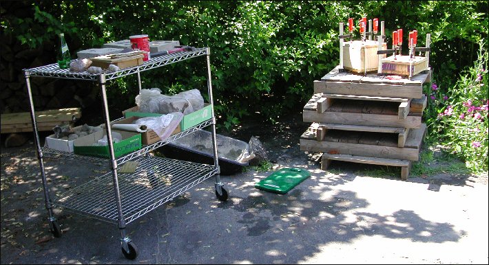 A photo of our outdoor work area at the end of the driveway. Notice the two setting cement sculptures--one in our original wooden form and another in the new larger-block wooden form. |